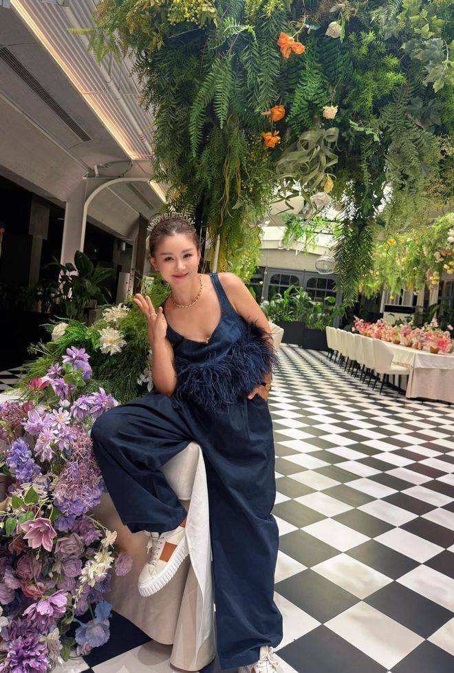 就拿她那条出圈的抹胸裙来说,上半部分用半透视网纱搭配立体刺绣,蓝粉交织的花卉图案既弱化了暴露感,又勾勒出柔美的线条。最妙的是抹胸高度卡在肩线下方,刚好露出纤细的锁骨和肩颈,既显身材又不用担心走光。浅杏色的裙身垂坠感十足,从腰腹处自然散开的A字裙摆,把可能存在的小赘肉藏得严严实实,这种“上紧下松”的版型对梨形、苹果形身材都特别友好。再配上低盘发和缎面蝴蝶结发饰,把视觉焦点往上提,整个人看起来优雅又俏皮。